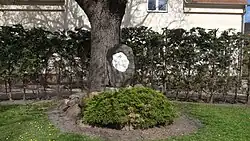 Auf einem dreieckigen Platz zwischen Kirche und Domäne befindet sich das Denkmal unter einem Baum.
