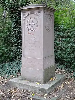 Da es neben den provisorischen Lazaretten im Westteil der Stadt auch solche am Universitätsplatz (Gymnasium im ehemaligen Franziskanerkloster), Marktplatz (Ratswaage, Ratskeller) und anderen Lokalitäten gab, wurden diese auf Soldatengottesacker neben dem Stadtgottesacker, dem heutigen Stadtpark, beerdigt.[2] Hier stiftete die Schiefer- und Ziegeldeckerinnung im Jahr ein Denkmal für diese Anlage, das am 3. August 1814, dem 44. Geburtstag des preußischen Königs Friedrich Wilhelm III., eingeweiht wurde. Der Innungsmeister J. C. Hennecke schuf einen Holzobelisken, der mit Schieferplatten verkleidet war. Diesen ersetzte man zum 18. Oktober 1839 durch die heutige Stele. Dabei versetzte man das Denkmal auch ein Stück nach Osten.[3] Am vorherigen Standort war es von Eichen umgeben.[4] Eine Restaurierung zum 150. Jahrestag im Jahr 1963 ist durch die Inschrift überliefert.