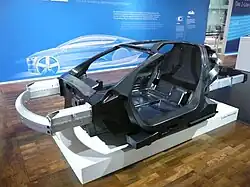 Bei dem XL1 sind die beiden Sitze im Unterschied zu den vorherigen Modellen nebeneinander angeordnet.[9] Damit hat sich auch der Luftwiderstand wieder erhöht, die Stirnfläche A beträgt nun 1,5 m2, der Luftwiderstandskoeffizient cw 0,186.[10] Das Fahrzeug wiegt 795 kg, wobei laut VW 21,3 Prozent davon aus CFK besteht, darunter das Monocoque (siehe Bild der Fahrgastzelle), 22,5 Prozent aus Leichtmetall und 23,2 Prozent (184 kg) aus Stahl. Die übrigen Masseanteile sind Kunststoffe, NE-Metalle, Naturfasern, Betriebsstoffe und die Elektronik.[8] Für den elektronischen Rückspiegel benötigte VW eine Sondergenehmigung.[11]