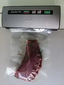 Vakuumiergeräte werden da eingesetzt, wo mit Lebensmitteln hantiert wird. Die Haltbarkeit und damit verbunden die Frische des Produktes spielen sowohl im Haushalt als auch in der Gastronomie und im Gewerbe eine große Rolle. Hierbei stehen das Vakuumiergerät und die Vakuumverpackung von Lebensmitteln im Mittelpunkt. Aufgrund des hohen Unterdrucks und des gleichbleibend hohen Vakuums im Vakuumbeutel kann die Haltbarkeit von Lebensmitteln deutlich verlängert werden. Haltbarkeitstabellen können Auskunft über die Verlängerung der Haltbarkeit durch Vakuumierer geben.[1] Hierbei spielen jedoch wichtige Faktoren eine Rolle, wie z. B. Hygiene, Lagerung und Art des Lebensmittels.