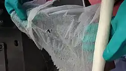 Der Schaufeltrockner besteht aus einem liegenden zylindrischen Heizmantel, in welchem ein eingebautes Schaufelwerk, das zweckmäßig heizbar ausgestattet ist, für die ständige Durchmischung des Produktes während des Trocknungsvorganges sorgt. Für die Umschaufelung des zu trocknenden Produktes durch die waagerecht angeordnete Rührwelle, spielt der Schüttwinkel (innere Reibungswinkel) des Produktes und seine Veränderung während des Trocknungsvorganges eine gewisse Rolle. Denn je größer der Schüttwinkel, desto höher wird das Produkt vom Schaufelwerk gehoben. Durch die entsprechende Fallhöhe tritt auch eine gewisse Zerkleinerungswirkung im Produkt ein, wodurch wiederum die Trocknung durch Vergrößerung der Produktoberfläche positiv beeinflusst wird. Durch Anpassung von Schaufelform und -breite kann den jeweiligen Produkten mit all ihren Eigenschaften Rechnung getragen werden. Für den Trocknungsvorgang selbst ist das Produkt mit möglichst viel Heizfläche in Kontakt zu bringen. Dementsprechend ist die Form und Größe der Schaufeln, entsprechend der Trocknungsaufgabe, so zu wählen, dass das geschaufelte Produkt auf die geheizte Schaufelwelle fällt, sich fortwährend und gleichmäßig durchmengt und sich optimal im Trockner verteilt. Darüber hinaus eignen sich die Schaufeln, durch entsprechende Formgebung, dazu, per Änderung der Drehrichtung das getrocknete Produkt aus dem Trockner auszutragen. Je nach Anwendungsfall kann der Austrag bzw. die Produkttrocknung batchweise oder kontinuierlich, letzteres über ein einstellbares Wehr, mit angeschossener Zellradschleuse bzw. Abförderschnecken o. ä., gestaltet werden.[4]