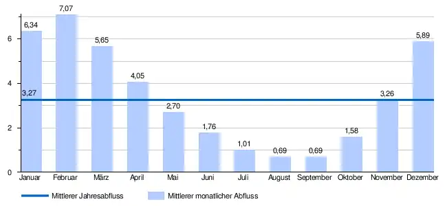 Die Abflussmenge schwankt im Lauf des Jahres recht stark. Die höchsten Wasserstände werden in den Monaten Dezember – März gemessen. Ihren Höchststand erreicht die Abflussmenge mit 7,07 m³/s im Februar. Von April an geht die Schüttung Monat für Monat zurück und erreicht ihren niedrigsten Stand im August/September mit 0,69 m³/s, um danach wieder von Monat zu Monat anzusteigen. Der jahresdurchschnittliche Wert beträgt hier 3,37 m³/s.