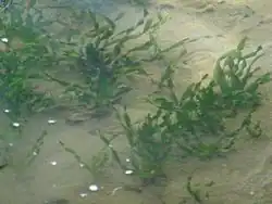 Die submersen Laubblätter sind alle grundständig oder wechselständig, spiralig oder zweizeilig am Stängel verteilt angeordnet.[5] Die Laubblätter bestehen aus Blattscheide und Blattspreite, aber sind immer ohne Blattstiel.[6] Die einfachen Blattspreiten sind linealisch oder riemenförmig mit einer Spreitenbasis, die allmählich in die Blattspreite übergeht, und einem stumpfen bis bespitzten oberen Ende.[1] Es liegt Paralleladerung mit acht bis neun Blattadern vor. Die Blattränder sind glatt oder winzig gesägt.[4]
