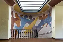 Im Inneren des Van-de-Velde-Baus war besonders die ungewöhnliche Belichtung des zentralen Treppenhauses mit breiter Wendeltreppe sowie die anlässlich der Bauhausausstellung von 1923 durch den Bauhausmeister Oskar Schlemmer (1888–1943) entworfene malerisch-plastische Ausgestaltung des Gebäudes sehenswert. Auf Veranlassung des durch die Nationalsozialisten eingesetzten neuen Direktors Paul Schultze-Naumburg wurde die Wandgestaltung von Schlemmer 1930 abgeschlagen und übertüncht, ohne den Künstler zuvor in Kenntnis zu setzen. 1979 rekonstruierten Hubert Schiefelstein und Peter Mader die beiden 1,90 m × 1,35 m großen Plastiken in den Nischen zu beiden Seiten der Eingangstreppe (Statische & dynamische Bewegungsthemen). Das 15 m breite und bis zu 6 m hohe Figurenfries, das die runde Wand der Wendeltreppe ins Obergeschoss begleitete (Treppenfresko), konnte 1979 von Bruno Dolinski rekonstruiert werden. Zahlreiche weitere Wandgemälde, Fresken und Reliefs blieben jedoch verloren.