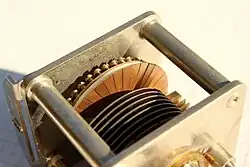 Drehkondensatoren haben einen Stator, ein Paket feststehender, auf Abstand gesetzter Metallplatten und einer gleichen Anzahl von mittig gesetzter Metallplatten auf einer Welle, einen Rotor und arbeiten mit Luft als Dielektrikum. Durch Drehen an der Welle werden die Elektroden kammförmig ineinander gedreht, wodurch sich die überlappende Fläche des Kondensators und somit die Kapazität ändert. Die Kapazitätswerte von Drehkondensatoren lagen üblicherweise zwischen 15 und 600 pF.[33] Luftdrehkondensatoren können mit Plattenabständen in Stufen gemäß der erforderlichen Spannungsfestigkeit mit etwa 1000< V bis 11.000 V hergestellt werden.[34]