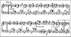 Variation II Die zweite Variation bildet zur ersten, rhythmisch akzentuierten Staccato-Variation einen starken Gegensatz: durchwegs ist legato vorgeschrieben. Durch eine animato auszuführende Überlagerung von Achteln und Achteltriolen sowie durch chromatische Wechselnoten in der vom Melodiegerüst des Themas geprägten Oberstimme und chromatische Gängen in den Unterstimmen verwischen die Konturen. Häufige crescendi und decrescendi innerhalb eines piano unterstützen das Auf und Ab dieser Variation. Übergangslos mündet die zweite Variation in die dritte. |