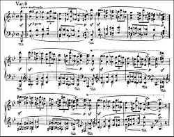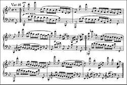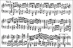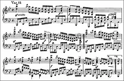 Variation XIII Largamente, ma no piú ist die dreizehnte Variation überschrieben. Sie bildet den gewichtig wirkenden Mittelpunkt der Variationenreihe, ist in b-Moll und soll laut und espressivo gespielt werden. Im Vordersatz kann man in der Oberstimme die variierte Grundgestalt der Themenmelodie und in der nachschlagenden Begleitung die Wechselnoten b-a-b der Themenunterstimmen erkennen. Ausweichungen in das parallele Des-Dur verändern den Mollcharakter dieser Variation ein wenig. Die weitgehend in Sexten geführte Oberstimme weist bereits auf die Sexten-Passagen der nächsten Variation hin. |