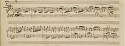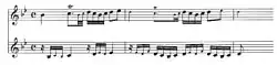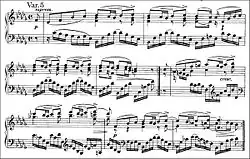 Variation XV und Variation XVI Ursprünglich waren diese beiden Variationen in umgekehrter Reihenfolge vorgesehen, doch Brahms stellte die Reihenfolge bereits auf dem ersten Autograph um.[4] Der Grund dafür ist unbekannt. Beide Variationen können als Variationenpaar gesehen werden, was nicht zwingend so ist, da sie durch eine Fermate getrennt werden und die sechzehnte Variation direkt mit der siebzehnten verbunden ist. Sie verwenden das 16tel-Motiv aus dem ersten Takt der Aria, das auch die sechste und die vorangehende vierzehnte Variation kennzeichnet. Die fünfzehnte Variation ist homophon gesetzt. Im Vordersatz wird die Unterstimme des mit Hornquinten versehenen 16tel-Motivs nach unten oktaviert und entspricht damit dem vorgeschriebenen forte. Im Nachsatz weicht Brahms wie schon in anderen Variationen nach b-Moll aus. Für die gesamte Variationenfolge einzigartig ist, dass diese Variation auf fünfzehn Takte ausgeweitet wurde. Die piano gehaltene sechzehnte Variation ist polyphon. Das 16tel-Motiv wird etwas variiert und zweistimmig mit enggeführten Nachahmungen verarbeitet. Die kontrapunktierenden Achtel sollen staccato und marcato gespielt werden. Dieser Variation folgt nahtlos die nächste. |