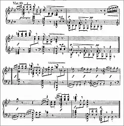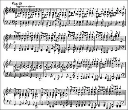 Variation X Forte und energico beginnen die beiden Teile des Vordersatzes, die wie die gesamte Variation von Achtel-Triolen geprägt sind. Linke und rechte Hand setzen im Wechsel die ungefähre Grundgestalt der Themenmelodie zusammen und gelangen dabei in immer tiefere Oktavlagen. Die Dynamik nimmt ab und die beiden Teile enden jeweils pp. Gleichzeitig wird aus dem hellen B-Dur ein dunkles b-Moll. Im weitgehend forte gehaltenen Nachsatz scheint sich b-Moll nach einer Ausweichung nach Ges-Dur durchzusetzen, doch der dynamisch zurückgenommene Schluss bietet keinen vollständig abschließenden Dreiklang, sondern eine ambivalent wirkende leere Quinte. Die dadurch erzeugte Spannung löst sich erst im B-Dur der nächsten Variation. |
