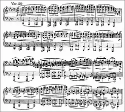 Variation XX Obwohl durch den Achtel-Auftakt mit der vorherigen Variation verbunden, zeigen die beiden Variationen nur eine Gemeinsamkeit: Der Vordersatz wird eine Oktave höher wiederholt, was diesmal auch im Nachsatz geschieht. Sonst bietet die chromatisch angelegte zwanzigste Variation insgesamt einen starken Gegensatz zur harmonisch einfachen neunzehnten. In der Oberstimme wird die diatonische Grundgestalt der Themenmelodie chromatisch aufgefüllt. In der zweiten Hälfte des ersten Taktes ergibt sich ein mehrmals verwendetes neues viertöniges Achtel-Motiv, das auch im Nachsatz wieder auftaucht, und dessen Expressivität durch ein dynamisches Anschwellen hin zum dritten Achtel, gefolgt vom sofortigen decrescendo verstärkt wird. Der zunächst in Achteln aufwärts gerichteten Oberstimme entgegen wirkt eine chromatisch abwärts schreitende Bassstimme in Vierteln. Der Nachsatz wird geprägt von zunächst aufwärts, dann abwärts führenden chromatischen Tonleiterabschnitten in der Unterstimme, über denen Zwischendominanten bis hin zum A-Dur-Dreiklang als Dominante von D-Dur und enharmonische Verwechslungen Spannungen aufbauen, die sich schließlich doch im B-Dur-Dreiklang lösen. Die insgesamt leise Variation verlangt ein strenges legato. |