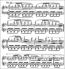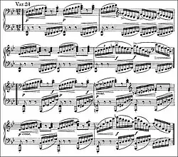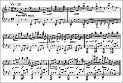 Variation XXIII und Variation XXIV Die beiden vivace zu spielenden Variationen bilden ein ineinander übergehendes Variationenpaar mit identischer Form. Sie stehen im 12⁄8-Takt und ähneln dadurch der zehnten Variation, in der die vier Dreiereinheiten eines Taktes allerdings als Triolen notiert sind. Ihre Vordersätze stehen auf einem Orgelpunkt (Variation XXXIII) beziehungsweise auf einer Bordunquinte (Variation XXIV) und pendeln zwischen dem B-Dur-Dreiklang und dem manchmal vollständigen, manchmal unvollständigen verminderten Septakkords a-c-es-ges. Die Nachsätze beginnen mit der Dominante und bringen danach den Quartsextakkord ges-c-es. Kurz darauf wird das ges zum fis enharmonisch umgedeutet, wodurch sich ein chromatisch aufwärts drängender Bass vom Fbis zum B ergibt. Beide Variationen haben nahezu denselben dynamischen Verlauf, der im Ansatz leise ist, immer wieder kurze Crescendi zum forte verlangt und insgesamt von leise nach laut führt. Im Wesentlichen ist die fünfzehnte Variation eine figurierte vierzehnte Variation. Deren aus Achtelnoten bestehende gebrochenen Akkorde werden teilweise mit 16tel-Noten aufgefüllt. Dadurch entsteht in der fünfzehnten Variation eine stringente durchlaufende 16tel-Bewegung, die ohne eigentliches Ende am Ende mit der Terz ges-b den verkürzten Sextakkord der Mollsubdominante bringt. Ihm folgt ohne Halt das klare B-Dur der letzten Variation. |