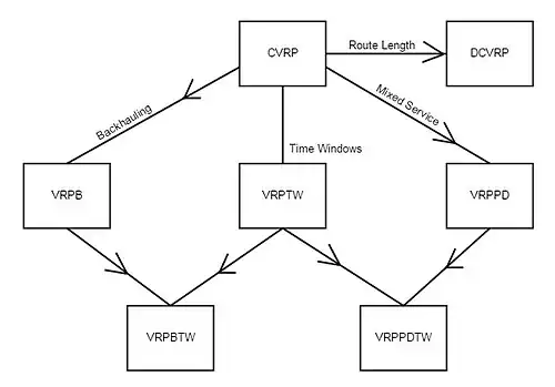 Es gibt viele Varianten des VRP, von denen einige wichtige hier angegeben werden. Die Basisversion sei hier das kapazitätsbeschränkte VRP (CVRP), welches oft verkürzt nur als VRP bezeichnet wird.[2]