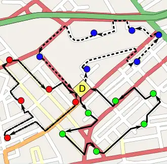 Das CVRP besteht darin, genau Kreise in zu berechnen, wobei jeder Kreis der Transportroute eines Fahrzeugs entspricht, sodass die Gesamtkosten minimal sind und folgende Bedingungen erfüllt sind:[2]