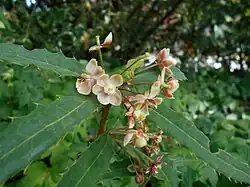 Bis zu acht lang gestielte Blüten sind in achselständigen Büscheln angeordnet. Die gestielten, zwittrigen Blüten sind rötlich-bräunlich bis gelb mit 15 Blütenhüllblättern.