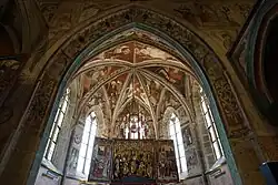 Die Ausmalung des Chores ist durch eine Aufschrift auf 1428 datiert. Die Westwand des Chores über dem Chorbogen ist mit einer Darstellung des Jüngsten Gerichts ausgemalt: Vor Christus in der Mandorla knien fürbittend seine Mutter Maria und Johannes der Täufer, während unter ihnen die Toten aus den Gräbern erstehen und von Petrus links ins Paradies geleitet oder von Teufeln in die Hölle auf der rechten Seite gezerrt werden. An der Nordseite des Chores schließt sich die Darstellung einer Schutzmantelmadonna an. Ihr gegenüber auf der Südseite empfängt Petrus die Geretteten im Paradies. Die Schildbogenfelder zeigen Szenen aus dem Marienleben, die Wände darunter schmücken die Kindheitsgeschichte Jesu, die Veitslegende in vierzehn, mit erläuternden deutschen Texten versehenen Bildfeldern und Darstellungen von Heiligen. Das Gewölbe ist mit Engeln im Joch vor dem Weltgericht, Evangelistensymbolen und den lateinischen Kirchenvätern Hieronymus, Augustin und Ambrosius bemalt, während Bernhard von Clairvaux den Platz von Gregor einnimmt.[10]