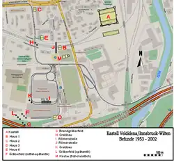 - ↑ Kulturberichte aus Tirol 2012, 63. Denkmalbericht, Denkmalpflege in Tirol, Jahresbericht des BDA 2010/2011, Juni 2012, Römisches Badegebäude in Veldidena, Graßmayr-Kreuzung, Gst.-Nr. 746, 747, KG Wilten, S. 191