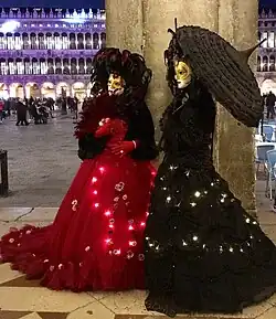 Neben den traditionellen Masken, die auch in den zur Karnevalszeit aufgeführten Theaterstücken auftauchten, gab es auch andere Masken und Verkleidungen. Ein fast ständig getragenes, wirkliche Anonymität gewährendes[9] Maskenkostüm war die baùtta, eine Verkleidung sowohl für Frauen als auch für Männer, die auch außerhalb des Karnevals zu den festgelegten Zeiten erlaubt war. Sie besteht aus einem schwarzen Umhang aus Seide oder Samt, der eine vorne geöffnete Kapuze hat, die das Gesicht frei lässt. Über die Kapuze wird eine schwarze oder weiße Maske (volto oder larva) gezogen, die das Gesicht nur bis zum Mund bedeckt. Dazu wird über der Maske der typische venezianische Dreispitz getragen.