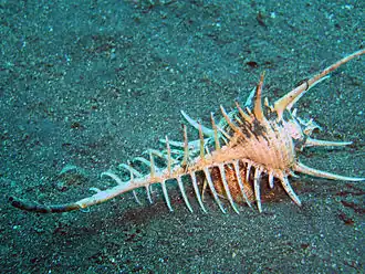 Murex pecten. Links ragt der schwärzliche Sipho aus dem Siphonalkanal heraus. | ||||||||||||