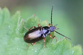 Die Käfer werden 6,5 bis 9 Millimeter lang.[2] Ihr Körper ist variabel gefärbt. Meistens sind die Tiere schwarz, die Deckflügel (Elytren) sind rotbraun, die Beine und Teile der Fühler sind braun. Es gibt auch Exemplare, deren Oberseite vollständig gelbbraun ist, wobei wiederum der Halsschild auch dunkler gefärbt sein kann. Der Kopf ist fein punktförmig strukturiert. Das letzte Tarsenglied ist groß und beilförmig verbreitert. Die Fühler sind lang, wobei das vierte Glied deutlich länger als das dritte ist. Das vollständig punktförmig strukturierte Halsschild ist quer und hat abgerundete Vorderecken. Die Hinterecken sind stumpfwinkelig. Die Deckflügel sind längsgestreift und sowohl auf den Streifen, als auch in den Zwischenräumen punktförmig strukturiert.[1]