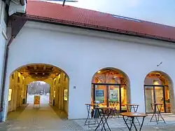 - Die zweigeschossige Tenne ist eine gut 100 Meter lange ehemalige Scheune. Im Erdgeschoss stehen neben dem Gastronomie-Stützpunkt und dem Sanitärbereich ca. 600 m² Nutzfläche zur Verfügung. Die durch das Dachgebälk vorgegebenen 36 Abteile (ca. 20 m² groß) im Obergeschoss verfügen über jeweils eigene Stromversorgung und eignen sich als Standplätze für Börsen, Märkte und Messen.