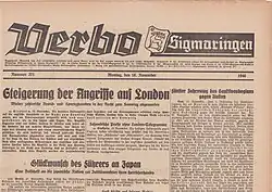 Die Machtergreifung der Nationalsozialisten brachte neue Herausforderungen. Am 1. September 1935 ordneten diese Eingliederung der Verbo in die NS-Presse an. Die Verbo wurde in die Oberschwäbische Verlagsgesellschaft GmbH eingebracht, an der die Altverleger des Verbo lediglich mit einer Minderheitsbeteiligung von 49 Prozent beteiligt wurden. Allein am Zeitungsdruck, der in die neu gegründete Oberschwäbische Zeitungsdruckerei GmbH umgewandelt wurde, erhielten diese das Alleineigentum. Diese neu gegründete GmbH musste jedoch für 10 Jahre einen Druckvertrag mit der örtlichen NS-Presse abschließen.[3] Am 1. April 1942 wurden die Verbo-Zeitungen zum NS-Blatt Donau-Bodensee-Zeitung zusammengefasst und die Lokalteile stark reduziert.[2][4] Vor dem Schutz weiterer Luftangriffe in Friedrichshafen wurden im Herbst 1943 die Druckmaschinen nach Leutkirch geschafft. Hintergrund der Verlagerung der Zeitungsproduktion war auch die Zeitung noch mehr unter Kontrolle der Nazis und aus den Händen des damaligen Verlegers Othmar Gesslers zu bekommen.[4][6] Am 28. April 1944 wurde bei die Verlagsbuchhandlung von Gessler und ein Teil der Verbo-Gebäude bei einem Bombenangriff in Friedrichshafen dann tatsächlich vollständig zerstört.[3] Am 20. April 1945 wurde die Produktion in Leutkirch eingestellt. Viele der ehemaligen Verbo-Mitglieder schlossen sich zusammen, um die Schwäbische Zeitung zu gründen, die bis heute eine der wichtigsten Regionalzeitungen in Baden-Württemberg ist.[1][2] Einige ihrer Vorgängerblätter, wie die Riedlinger Zeitung, die bereits 1714 gegründet wurde, gehören zu den ältesten noch existierenden Tageszeitungen in Deutschland.[2] Weitere Vorgängerblätter waren: