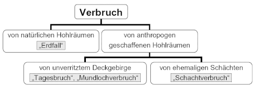 Verbrüche werden unterteilt in natürlich entstandene und durch menschliche Einwirkung entstandene Verbrüche.[6] Mit dem Begriff „Erdfall“ wird ein über natürlichen Hohlräumen (z. B. Karst) gefallener Verbruch bezeichnet.[13] Über anthropogen hergestellten Hohlräumen entstandene Verbrüche werden in Tagesbrüche und Schachtverbrüche aufgegliedert. Grund hierfür sind die geomechanischen Verschiedenheiten des Bruchvorganges. Schachtverbrüche sind durch ein mehr oder weniger plötzliches Abgehen der Schachtfüllung inklusive ggf. vorhandener Einbauten charakterisiert. Tagesbrüche zeichnen sich in der Regel durch keinen derart vorgezeichneten Bruchschlot aus.[6] Alle diese Verbrüche verursachen in der Regel hohe Kosten und können je nach Gegend, in der sie auftreten, sogar Verluste an Menschenleben verursachen.[14]