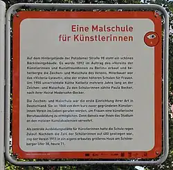 Der Verein der Berliner Künstlerinnen und Kunstfreundinnen hatte seit 1868 eine eigene Kunstschule am Askanischen Platz 7, die ab 1871 auch eine „Zeichen- und Malschule“ mit angeschlossenem „Zeichenlehrerinnenseminar“ umfasste. Die Unterrichtung erfolgt zu Anfang durch renommierte Akademieprofessoren.[2] 1893 erwarb der Verein, zusammen mit dem Victoria-Lyzeum für höhere Frauenbildung, ein Gebäude für die Zeichen- und Malschule in der Potsdamer Straße 39 (heute 98a). Mit gestiegener Schülerzahl zog der Verein 1911 in ein eigens erbautes Haus am Schöneberger Ufer 38 (heute 71).
