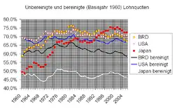 Laut Heinz-Josef Bontrup ist die Verelendungstheorie in den hoch entwickelten Industrieländern durch die Entwicklung der Lohnquote widerlegt. Insbesondere durch die Herausbildung von Gewerkschaften, die am Arbeitsmarkt einen Gegenpol zum Kapital entwickelten, habe sich laut Bontrup das Verteilungsergebnis des Arbeitsertrags zugunsten der Arbeiter und Angestellten verändert. In Deutschland sei die Brutto-Lohnquote von 43,1 Prozent im Jahr 1780 auf 60,2 Prozent 1930 gestiegen und habe unmittelbar vor Beginn des Zweiten Weltkriegs 54,9 Prozent betragen. Ihren Höhepunkt habe sie 1981 mit 75,3 Prozent erreicht, bis 2006 sank sie jedoch auf 65,6 Prozent. Dennoch könne eine positive langfristige Entwicklung der Lohnquote konstatiert werden.[32] Nach Erich Arndt ist „diese sehr langfristige Steigerung [...] wohl nicht nur auf das Wirksamwerden eines Machtausgleichs der Gewerkschaften auf dem Arbeitsmarkt, sondern vor allem auch auf das relative Anwachsen der Zahl unselbständig beschäftigter zurückzuführen. Nach Wirksamwerden dieses Machtausgleichs nach dem Ersten Weltkrieg sind die Schwankungen langfristig wesentlich geringer ... Die Tatsache nun, dass die autonome Nominallohnpolitik der Verbände auf dem Arbeitsmarkt, insbesondere der Gewerkschaften, von sich aus allein nicht imstande ist, eine nachhaltige, über die Produktivitätsrate der Volkswirtschaft hinausgehende Reallohnerhöhung zu erreichen, gebiert eine weitere Aufgabe der Sozialpolitik“.[33]