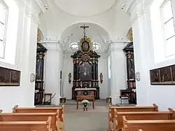 Die drei Altäre aus den Jahren 1708 und 1709 vom Allgäuer Johann Georg Haggenmüller (1732 und 1905 renoviert) haben einfache Säulenarchitekturen in Marmor und Kunstmarmor mit abgebrochenen Segmentgiebeln, zwischen denen sich ovale Giebelbilder erheben. Letztere sind in die von Josef Leonz Brandenberg reich geschnitzten Rahmen gesetzt.