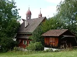 Neben der Kapelle steht das 1725 erbaute und 1780 erweiterte ehemalige Bruderhaus. In dessen Keller sollen Überreste der ersten Kapelle erkennbar sein.[3] Heute ist das Haus zweistöckig, der Spitzboden ist zusätzlich ausgebaut. Die Fassaden sind mit Holzschindeln verkleidet. Auf der West- und auf der Ostseite erstreckt sich ein markantes Schattendach über den Fenstern des ersten Stockes über die ganze Hausbreite, ebenso auf der Südseite über den Fenstern des Erdgeschosses. Vor dem Haus befindet sich ein auffälliger Granitbrunnen, hinter dem Haus ein Holzschuppen.