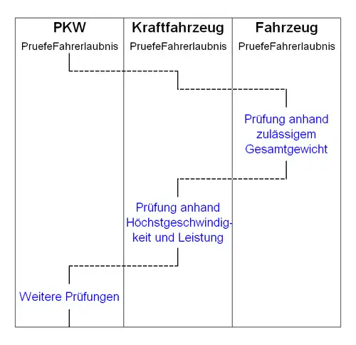Anhand des einführenden Beispiels lässt sich eine solche Aufrufkaskade erläutern. Die Methode PruefeFahrerlaubnis gibt dabei zurück, ob die Prüfung durchgeführt werden konnte, und wenn dies der Fall ist, zusätzlich das Ergebnis dieser Prüfung. Die Implementierung der Klasse PKW ruft zunächst die Implementierung der Klasse Kraftfahrzeug auf, um die Fälle abzuhandeln, die anhand Höchstgeschwindigkeit, Leistung oder zulässigem Gesamtgewicht entscheidbar sind. Die Implementierung in Kraftfahrzeug wiederum delegiert die Prüfung des zulässigen Gesamtgewichts weiter an seine Basisklasse. Nach Rücksprung aus den gerufenen Basisimplementierungen wird die Prüfung jeweils fortgesetzt, wenn der Fall noch nicht entschieden werden konnte.