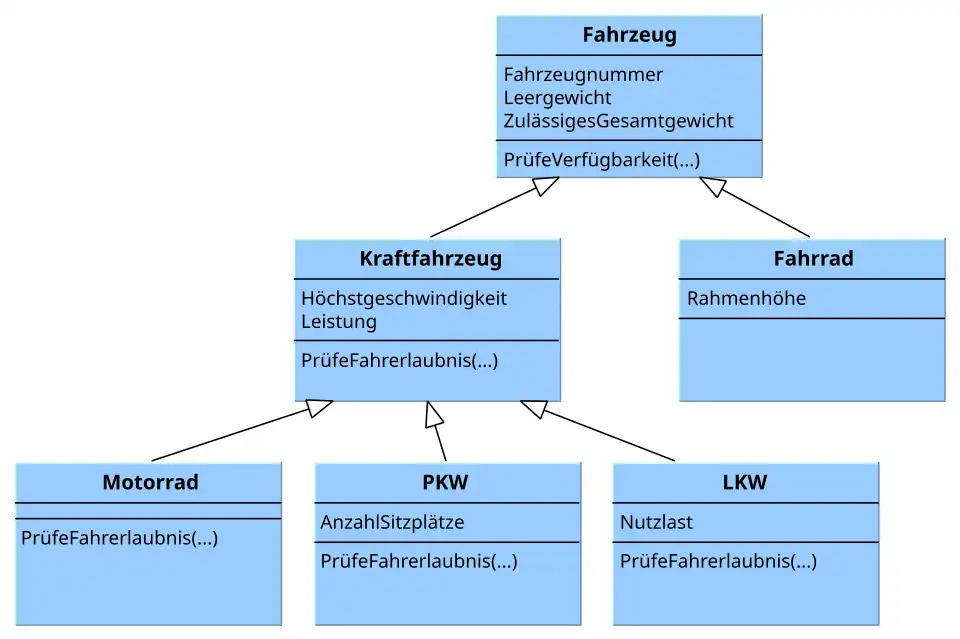 Das folgende Beispiel stellt einen möglichen Ausschnitt aus dem Anwendungsgebiet der Unterstützung eines Fahrzeugverleihs dar. Die Basisklasse Fahrzeug enthält die Attribute Fahrzeugnummer, Leergewicht und ZulässigesGesamtgewicht. Die Spezialisierungen Kraftfahrzeug und Fahrrad ergänzen weitere Attribute zu den von der Basisklasse geerbten Gewichtsangaben und der identifizierenden Fahrzeugnummer. In jedem Objekt der Klasse Kraftfahrzeug werden also die Attribute Fahrzeugnummer, Leergewicht, ZulässigesGesamtgewicht, Höchstgeschwindigkeit und Leistung gespeichert. In der Klasse Fahrzeug gibt es die Methode PruefeVerfuegbarkeit, die unter Verwendung der Fahrzeugnummer die Verfügbarkeit eines bestimmten Fahrzeugs ermittelt, beispielsweise durch einen Datenbankzugriff. Diese Methode wird von allen Spezialisierungen geerbt und ist somit für diese ebenfalls nutzbar. Dasselbe gilt auch dann, wenn nachträglich eine weitere Methode in der Klasse Fahrzeug ergänzt wird, beispielsweise eine Methode HatNavigationssystem, wenn ein Teil der Fahrzeuge mit Navigationssystemen ausgestattet wird.