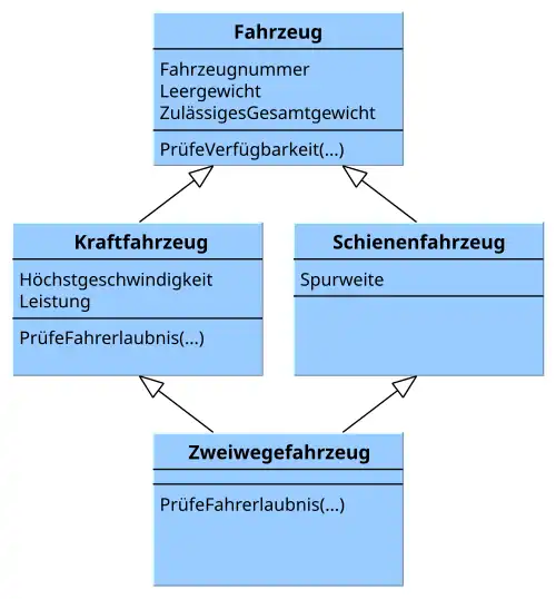 Ein anderes Beispiel für Mehrfachvererbung ergibt sich durch die Erweiterung des einführenden Beispiels um die Klassen Schienenfahrzeug und Zweiwegefahrzeug. Letztere erbt dabei sowohl von Kraftfahrzeug als auch von Schienenfahrzeug und hat somit sowohl alle Attribute der Kraftfahrzeuge als auch das zusätzliche Attribut Spurweite, das von Schienenfahrzeug geerbt wird.