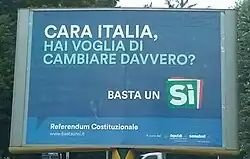 Im Verfassungsreferendum in Italien am 4. Dezember 2016 stimmten die Wahlberechtigten über eine vom Parlament der Italienischen Republik gebilligte Verfassungsänderung ab. Diese sah eine Neuordnung des Parlaments, insbesondere eine tiefgreifende Reform des Senats und eine Rückführung bisheriger Kompetenzen der Regionen zum Staat vor. Nachdem das Verfassungsreferendum gescheitert war, kündigte Ministerpräsident Matteo Renzi seinen Rücktritt an.[1] Ein von Silvio Berlusconi initiiertes, ähnliches Reformvorhaben von Italiens Senat, allerdings im Rahmen einer Föderalismusreform zur Stärkung der Regionen, war zuvor in einem Verfassungsreferendum am 25. und 26. Juni 2006 ebenfalls gescheitert.[2]