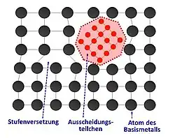 Ausscheidungsteilchen als Hindernis für die Versetzung Auslagern bei mittlerer Temperatur zur Umwandlung der metastabilen Mischkristalle in zwei Phasen, bestehend aus Basismetall (auch Matrix genannt) und kleinen Ausscheidungsteilchen (siehe Abbildung).