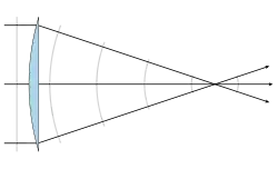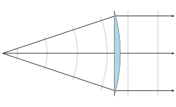 Trifft umgekehrt eine ebene Welle (, parallele Strahlen) auf eine Sammellinse, so erhält das Bündel die positive Brechkraft D der Linse als Vergenz: unmittelbar hinter der Linse gilt: