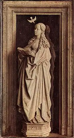 Dargestellt ist die Verkündigung der Geburt Jesu durch den Erzengel Gabriel an Maria. Beide erscheinen dem Betrachter als steinerne Skulpturen, die in flachen Nischen stehen, umgeben von einem beschrifteten, ebenfalls gemalten Rahmen. Die Figuren wirken durch die Anwendung von Licht und Schatten realistisch und plastisch und scheinen aus dem Bildrahmen herauszuragen, insbesondere durch die den Rahmen überschneidenden Flügel Gabriels und die hervorspringenden Sockel.[2] Das Gemälde zählt zu den herausragenden Meisterwerken der altniederländischen Malkunst. Erwin Panofsky nannte es eine Symphonie in Marmor.