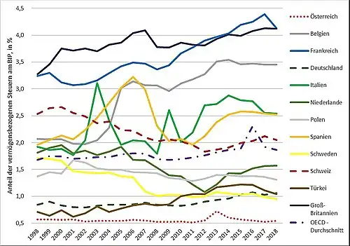 Im Durchschnitt der OECD-Staaten schwankte das Aufkommen der vermögensbezogenen Steuern am BIP von 1998 bis 2018 zwischen 1,7 und 2,3 %. In dieser Zeit senkte die Schweiz ihren Anteil und näherte sich damit dem OECD-Durchschnitt an, während Deutschland und Österreich zu den europäischen OECD-Ländern mit dem niedrigsten Anteil der vermögensbezogenen Steuern gehörten.[1]