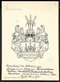 Das Wappen zeigte ursprünglich drei Rohrkolben über drei Wasserwellen.[3] Julius Vermehren änderte das Wappen von Rohrkolben auf Kornähren ab. Eine weitere Abänderung findet man Wappen Nachschlagewerken: In Silber aus grünem Boden wachsende drei Ähren, der Helm hat eine grün-silberne Binde, darauf die Ähren.[4]