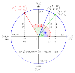 Multipliziert man beide Seiten mit , erhält man . Generell gibt es eine enge Korrespondenz zwischen rationalen Punkten auf dem Einheitskreis und sog. pythagoräischen Tripeln.[22]