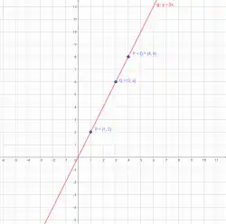 Dadurch, dass gleich zwei Größen, nämlich und , nicht näher benannt sind, ist eine größere Anzahl an Lösungen zu erwarten. Als Beispiel kann der Fall betrachtet werden: „Vollständig sichtbare“ Lösungen benennen beide Unbekannte, hier etwa , oder . Erst das Aufspannen zweier Dimensionen – also einer „x-Dimension“ und einer „y-Dimension“ – erlaubt es, dieses Kollektiv ganz zu fassen (siehe Bild 1). Wegen handelt es sich ferner um nichts anderes als eine tabellarische Auflistung aller Punkte der Form .[1] Aus geometrischer Sicht ist es naheliegend, die daraus entstehende Kurve als Gerade zu bezeichnen.