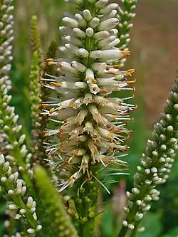 Der lange, endständige, schlanke, dichte und vielblütige Blütenstand an schlanken Tragblättern ist eine aufrechte, pyramidale Traube die bis 30 cm lang wird. Die Blütenständen erscheinen einzeln oder zu mehreren. Die kleinen, kurz gestielten, nicht duftenden,[3] 4–5-zähligen Blüten mit doppelter Blütenhülle sind zwittrig mit kleinen Deckblättern. Die 4 röhrig verwachsenen Kronblätter mit kurzen, aufrechten Zipfeln, zwei sind etwas kürzer, sind weiß oder gelegentlich rosa oder bläulich bis violett und etwa 4–5 mm lang. Der ungleiche 4–5-zählige Kelch ist klein. Die zwei im unteren Teil behaarten Staubblätter sind vorstehend, der zweikammerige Fruchtknoten ist oberständig mit etwas vorstehendem Griffel mit minimaler Narbe. Es ist ein Diskus vorhanden. Die Pflanze blüht etwa einen Monat lang, von Mitte Juni bis Ende August, je nach Breitengrad.