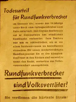 - ↑ RGBl. 1939 I, Seite 1683 / Michael Hensle: Rundfunkverbrechen, S. 36 f.