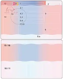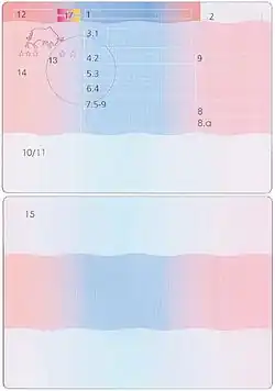 - 17. Maschinenlesbare Zone gemäß den Richtlinien des ICAO-Dokuments 9303 über maschinenlesbare Reisedokumente.