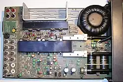 Verstärker einer HiFi-Anlage, Gehäuse geöffnet, rechts oben Ringkerntrafo, links davon Kühlblech mit Transistoren und Kühlschlitze