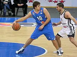 Darüber hinaus kann auch versucht werden zu verhindern, dass ein Angriffsspieler überhaupt den Ball bekommt. Einerseits kann dies durch Druck auf den Aufbauspieler oder durch Verstellen des Passweges (engl. overplay) erreicht werden. Ein Verteidiger steht so, dass er den Pass zwischen dem ballführenden Spieler und dem möglichen Empfänger behindert. Er verhindert entweder, dass der Pass überhaupt gespielt wird oder er spekuliert auf einen Ballgewinn (engl. steal), falls der Pass doch gespielt wird. Das Risiko hierbei ist, dass es bei Misserfolg zu sehr leichten Punkten für die gegnerische Mannschaft kommen kann. Deswegen wird diese Form meist versteckt gespielt, um dem Angreifer eine Falle zu stellen. Oft wird der Steal nicht durch den direkten Gegenspieler des ballführenden Spielers versucht.[11] Zusätzlich kann dem ballführenden Angreifer das Spielen eines Passes dadurch erschwert werden, dass man ihm eine Hand vor das Gesicht hält und so sein Sichtfeld entscheidend einschränkt.[12] Wird ein Pass gespielt, formiert sich die Verteidigung im Moment der Ballabgabe neu (nicht erst beim Fangen) und stellt sich auf den neuen ballführenden Spieler ein.