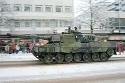 Das Standardsturmgewehr der finnischen Armee ist das Valmet RK 62 7,62 mm, eine Weiterentwicklung der sowjetischen Kalaschnikow, die von den heimischen Rüstungsbetrieben Valmet und Sako gefertigt wird. Das Panzerarsenal im Jahr 2021 umfasste 200 Kampfpanzer, davon 100 Leopard 2A6 und 100 eingelagerte Leopard 2A4 sowie rund 1000 weitere Panzerfahrzeuge, beispielsweise Transportpanzer des Typs Sisu Pasi.[11]