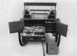 Der hölzerne Wagenkasten diente zur Aufnahme von Zubehör und Vorratsteilen, einschließlich Beleuchtungsgerät. Das Innere des Kastens war in fünf Fächer eingeteilt. Die Wagenkastendecke war in der Mitte durch ein hölzernes Lehnbrett und zwei hölzerne Querleisten geteilt. Die vordere Hälfte diente als Sitz für den Fahrer und hatte rechts und links je eine belederte Armlehne. Auf Höhe des Untergestells gab es ein Fußbrett.[2] Der Rückwärtige Teil der Decke hatte ein Gepäckgitter in dem rechts und links je ein Dreikant-Kanister für 20 l Kraftstoff festgeschnallt war. Der Freiraum zwischen den Kanistern war für das Gepäck des Fahrers und des Begleitmannes gedacht. Man konnte das Gepäckgitter durch eine Plane gegen Witterungseinflüsse schützen.[3]