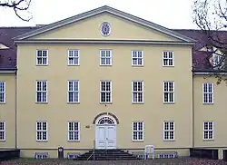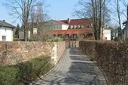 Eine Freitreppe und eine Terrasse mit Balustraden führen zum Haupteingang im Mittelrisalit. An der Terrasse stehen zwei Obelisken aus Sandstein mit Leuchten. Die Zaunfelder des Holzzauns haben oben konvexe Bögen. Der gestaltete Eingangsbereich gilt als denkmalpflegerische Nebenanlage.[1]