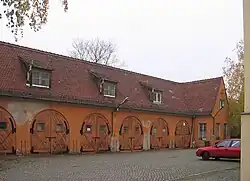 Hinter dem ehemaligen Verwaltungsbau steht eine langgestreckte, denkmalgeschützte Garage[1] mit einem steilen Satteldach mit Fledermausgauben und rundbogigen Toren. An den Enden befinden sich kurze Flügelbauten mit hohen Dreiecksgiebelchen.